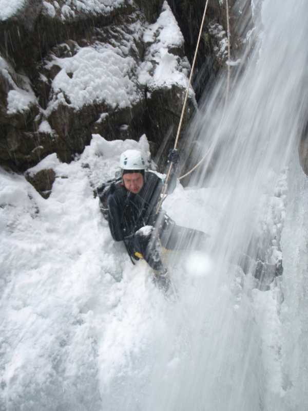 Le canyon commence et nous sommes directement dans le bain : une première petite vasque nous rassure sur l’efficacité de notre équipement … sauf Orel qui a acheté à l’arrache des gants pour la cascade de glace faute de mieux : la sanction ne se fait pas attendre ;-).