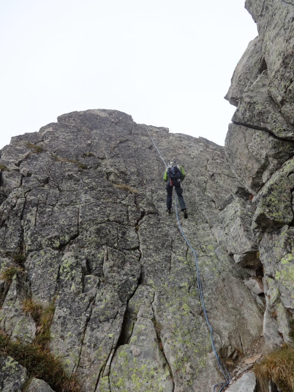 Nous sommes un peu avant 10h30 au pied du premier éperon et nous sommes soudainement pris d'un doute : ca va pas le faire le rocher est tout mouillé, brume matinale ou pluie de la veille ? bref... ça glisse à mort sur le granit ! Du coup, on patiente et on attend que ça sèche... Le soleil est masqué par des nuages et une brume persistante entoure la crête... On patiente encore : ça vallait bien le coup de partir si tôt !!!