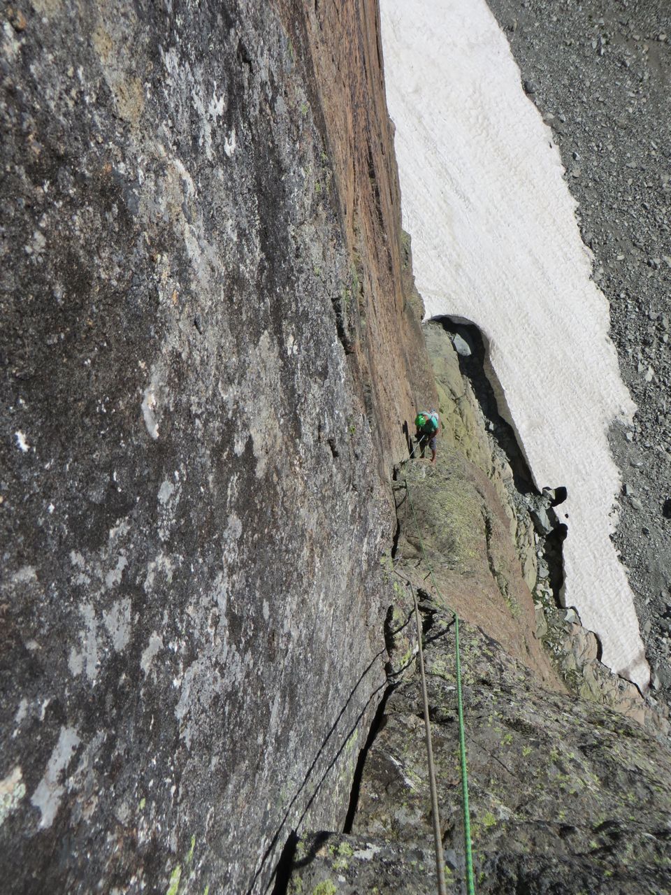 Je sais pas si c’était majeur, en tous cas c’est de la belle escalade pas que sur les pieds et qui se protège très bien ! Prendre un jeu complet de friends jusqu’au numéro 4 (vert et rouge en double c’est mieux), les cablés et un alien bleu. On n’a pas utilisé les ballnuts… Y a des pitons plutôt bons qui trainent de ci de là. Et on a repéré un truc ou 2 à la descente. Pourvu que l'été indien s'installe !!!