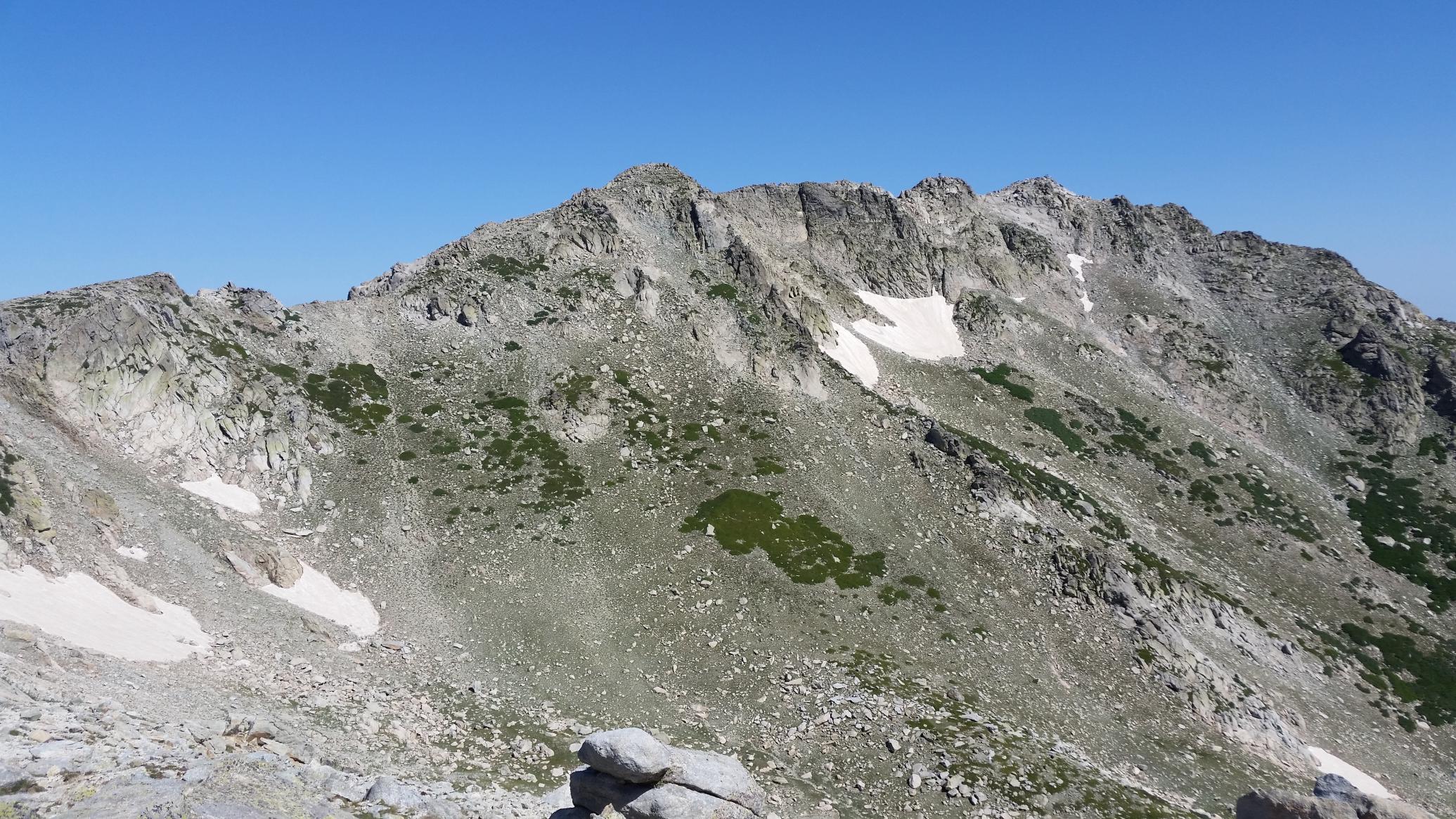 et à l'arrivée, vue sur le Monte Renoso qui se dresse à 300m de moi et quelques 50md+, que nous fîmes l'année par la station de Ghisoni (LA rando 2017)