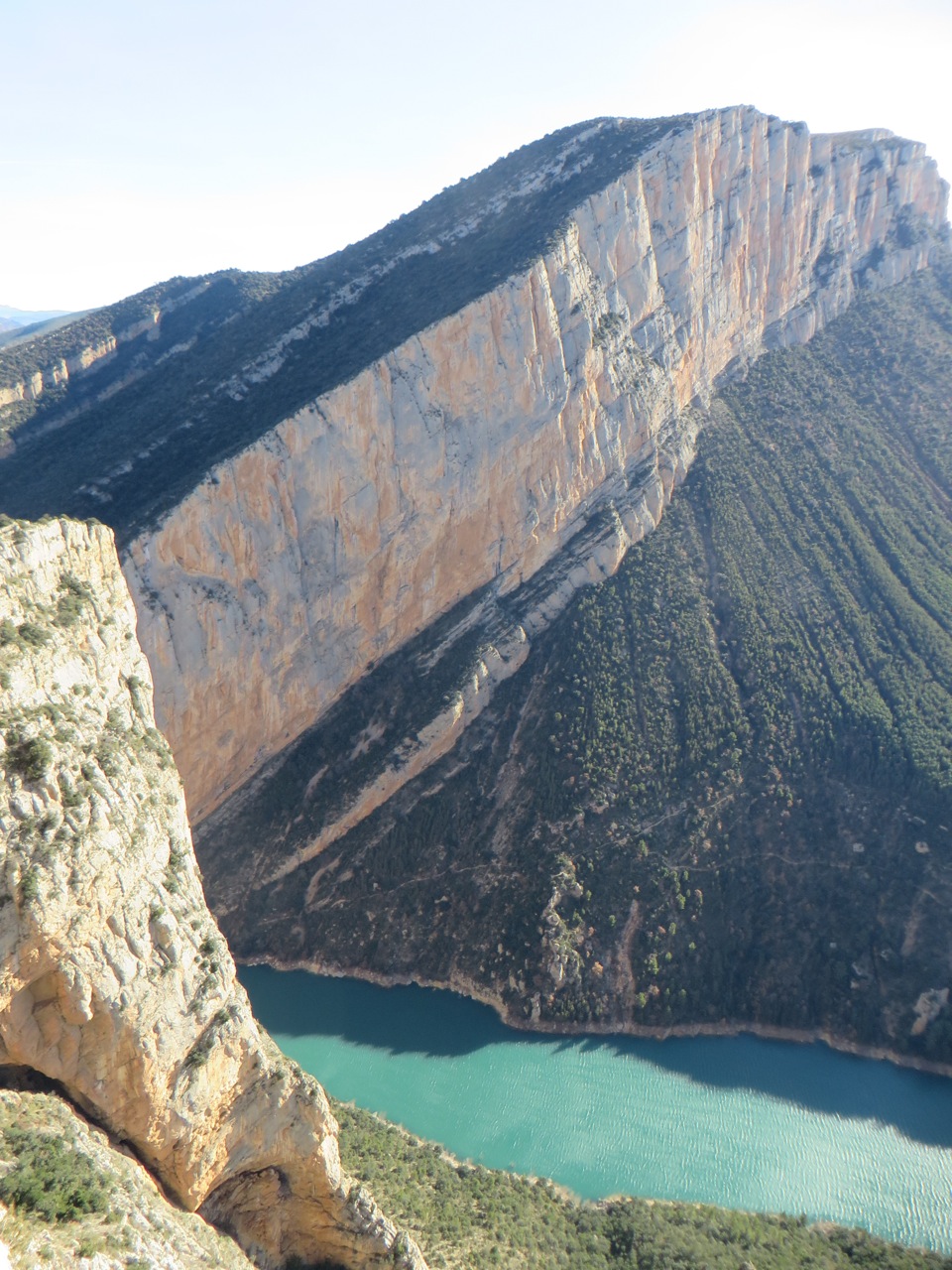 La paret de Doll (J1) est située juste au sud du défilé des Terradets. Le cadre est magnifique, le caillou demande un peu de précautions. La falaise fait environ 300m de haut, et démarre juste au-dessus de la retenue d'eau de Camarasa. Parmi les voies recommandables apparemment : Manowar et la Triple directa (enchainement inventé par Luichy, que nous avons justement suivi), toutes deux en 6b+ avec un peu de protections à poser.