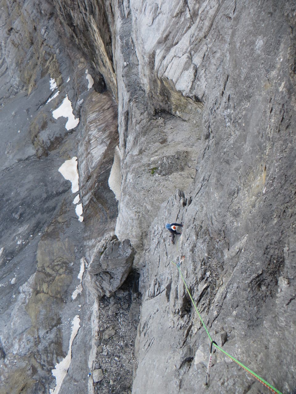 Un gars qui a bivouaqué sur la terrasse du refuge nous le confirme, pas une goutte ici cette nuit. On re-re-change de plan, on cache notre quincaillerie sous un rocher, et on part avec les dégaines (on en a juste assez, ouf !), un optimisme modéré, et un sympathique binôme de grimpeurs locaux, pour la face N (oui, ça va on commence à connaitre l’approche…)