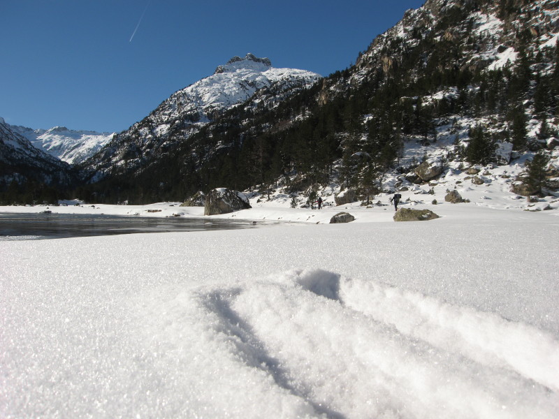 Après le dessert … il faut faire la vaisselle :-( : c'est-à-dire il faut se cogner le retour par la piste de ski de fond. Ca commence par du ski de combat (tels des pilotes de chasse en plus d’être agiles … « nous sommes moyens même dans les situations psychologiquement difficiles » (c) Hervé), puis ça continue par un défilé magnifique mais très long jusqu’au Pont d’Espagne.