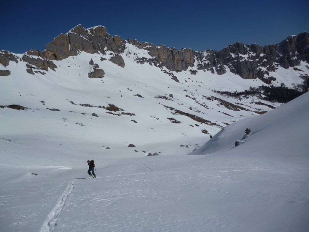 Il nous reste maintenant le dessert... on récupère un peu et c'est parti... Au lieu de revenir sur nos pas, on va chercher la jolie combe, repérée à la montée sur la photo ci-dessous... C'est un peu raide pour Orel, mais ça passe bien, même si la neige est un peu croutée sur le haut... ça s'améliore sur le bas de la combe !