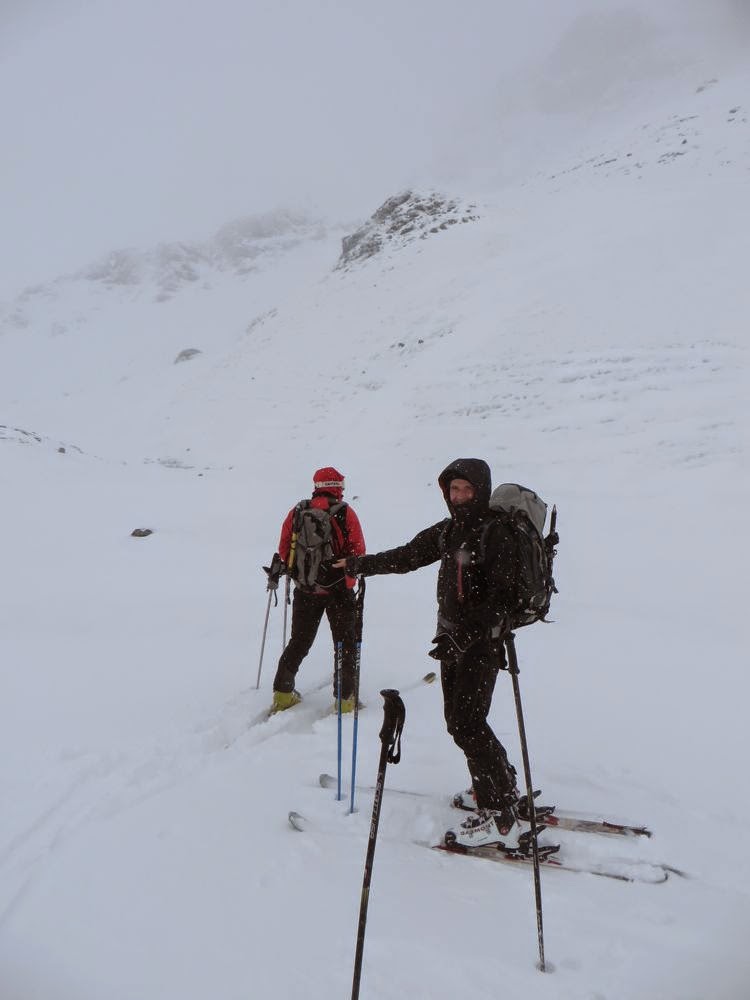 Nous devinons l'accès à la crête dans les nuages avec une visi quasi nulle puis dépeautons rapidement pour amorcer la descente après que j'ai perdu un ski au premier virage , récupéré in-extremis( réglage de début de saison).