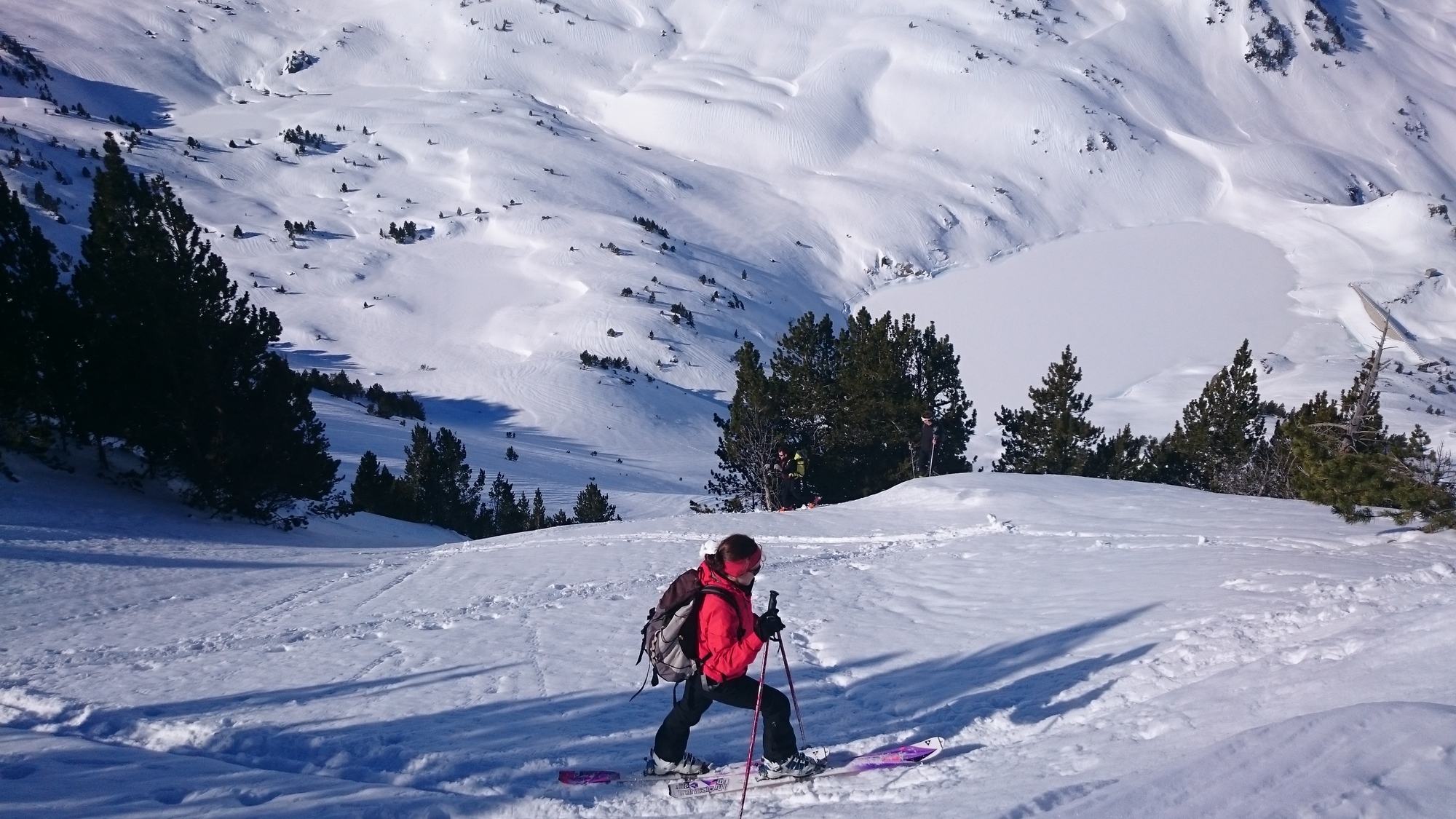 Jeudi matin donc, nous voilà reparti avec Anna pour aller skier. On part de Tournaboup sous le soleil en direction de Dets Coubous, on passe le mur en bonne condition, et arrivée au lac on vise un col au sud du Pic de Tatouère. La crête qui conduit au Tatouère n'est pas très engageant : neige gelée/verglacée par le vent. On décide de s'arrêter là (900m d+). Il fait grand soleil, la descente en poudreuse sur fond dure est piégeuse et physique, mais on ne va pas se plaindre pour autant !