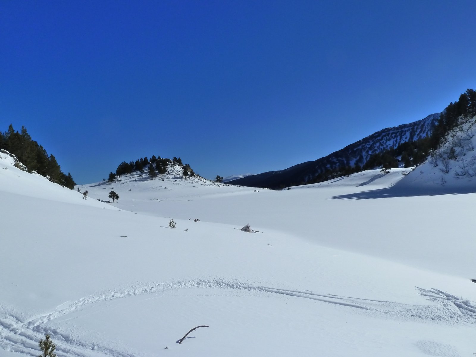 La vue est top sur l'Ariège qui a repris des couleurs en cette hiver bien pauvre, toutefois les faces est semblent avoir pris le vent et je commence à douter de la qualité de la descente. On bascule quand même sud est en descendant l'épaule qui mène au Pic de la Coumeille de l'Ours sur une neige un peu soufflée. Au col il faut basculer plein sud (ou avant si le manteau est assez stable), un groupe de 4 personnes nous a précédé mais les traces qu'ils ont laissé nous font vite comprendre qu'on va se gaver, un bon 25 cm de fraîche nous attend. On descend dans une succession de petites combes bien marquées et très ludiques avec plusieurs mini couloirs au choix.