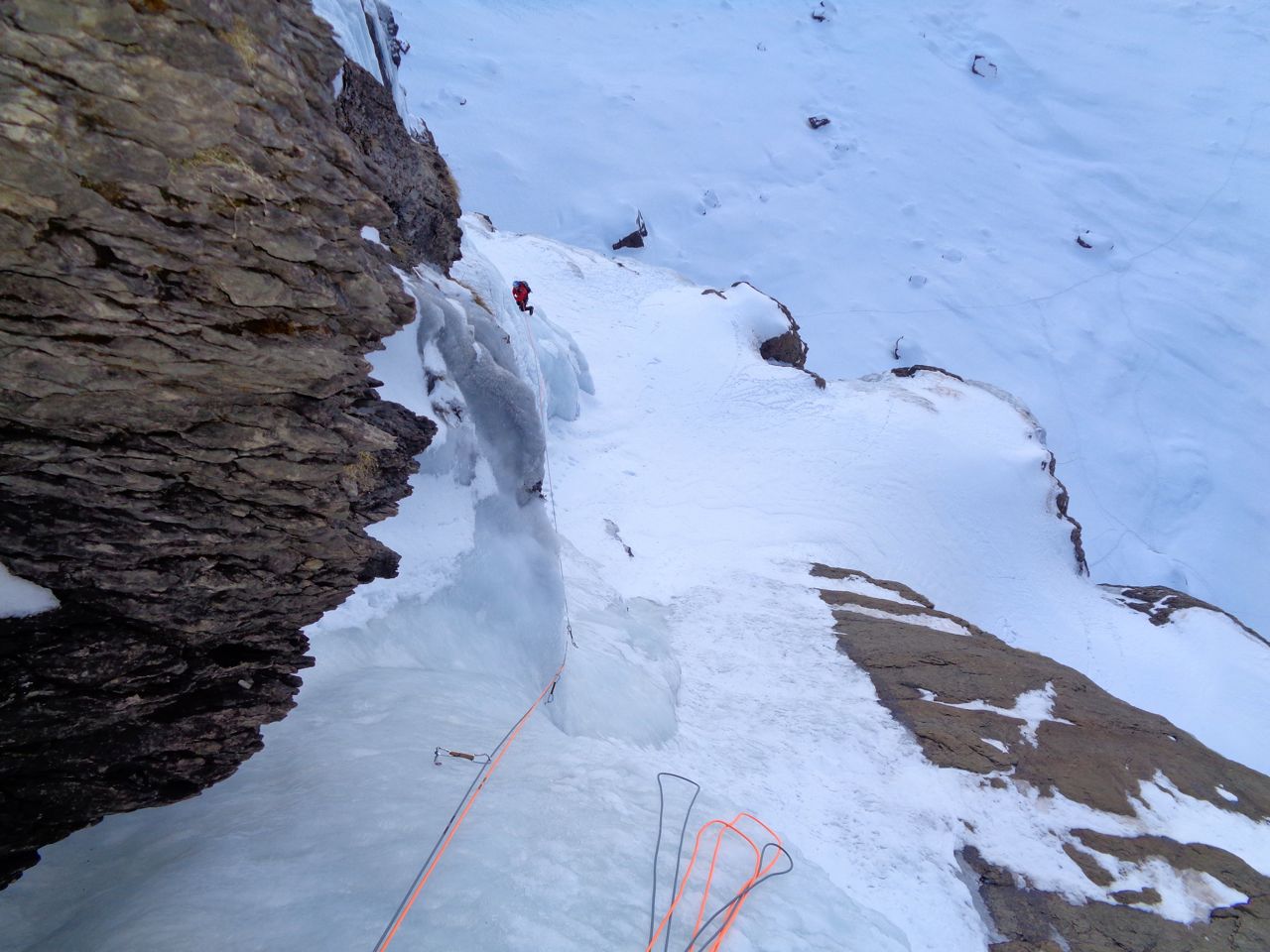 Très beau mur dans les premières longueurs, traversée esthétique sur la vire, et final "ambiance" dans la goulotte de sortie. Et cette fois-ci, on (en tout cas Cédric !) en a vraiment (encore plus) profité. Avec cette qualité de glace, c'est plus facile...On a bien avancé sans pour autant se presser (6h dans la voie).