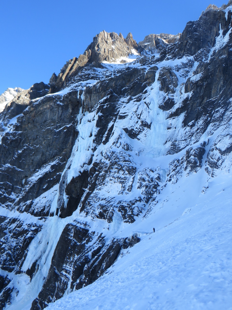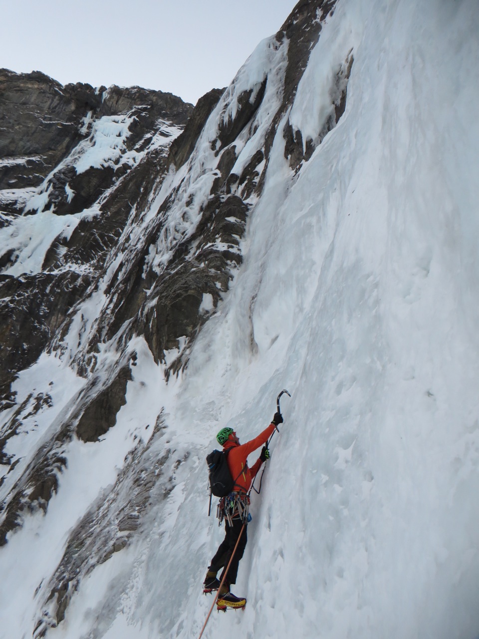 Déjà plusieurs cordées sont au pied des cascades dans la nuit, et même certaines ont attaqué ! Par élimination, on vise Fluide glacial où il n’y a que deux cordées. Le temps de s’équiper, ils seront déjà partis, et au final on ne se gênera pas :-) La ligne est en top conditions, et c’est magnifique.