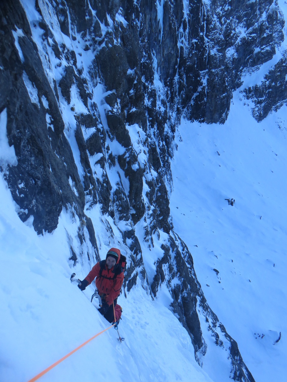 Pat est ébahi par le spectacle. Gavarnie, c’est grand ! Toutes les longueurs sont belles ! On se fait plaisir dans le cigare dans L2 (pas trop dur à grimper, un peu plus à protéger), dans la belle L3 et son dièdre glacé pas si couché que ça,