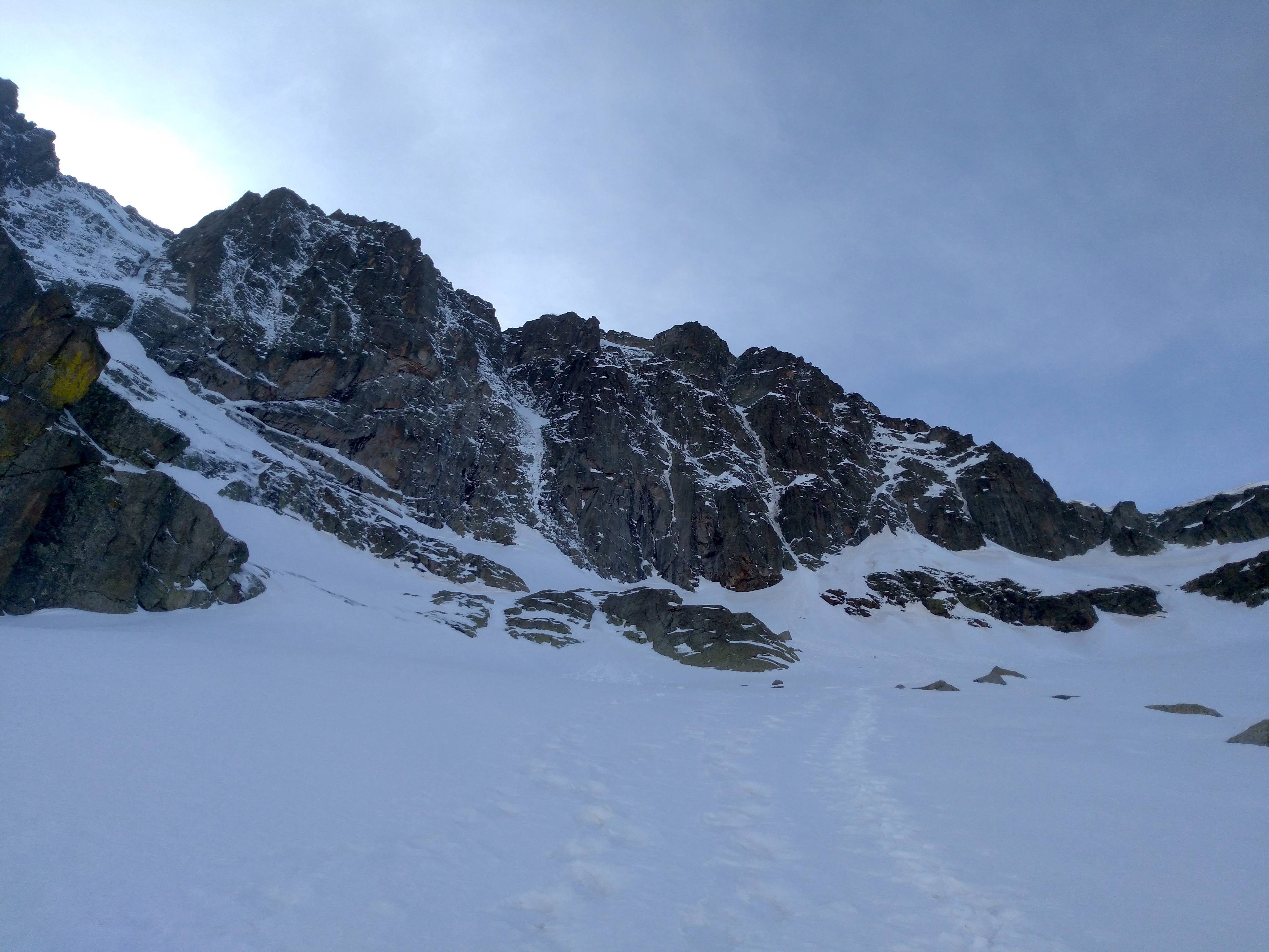 On laisse les batons dans la bas de la grande combe qui mène au pied de la face, et là le doute s’installe : la neige est de moins en moins dure, plus ça va plus on enfonce, moins le moral est là. Les derniers mètres se font au ralenti, on y croit plus, ça coûte !! Au pied de la goulotte c’est pas l’optimisme. Après une petite hésitation, j’y vais voir. Et là c’est la bonne surprise : dans la goulotte la neige est très dure, et il y a même un peu de glace !