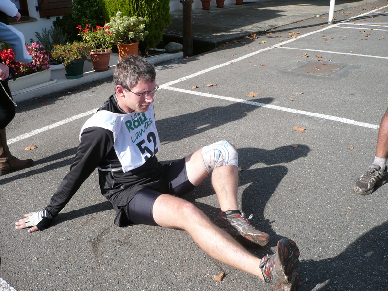 Au bout de 50m Greg realise qu'il a oublié les protections des poignets. "Je te file les miennes t'en fais pas je vais pas tomber" lui réponge. On rattrape ensuite rapidement Orel et Fino partis devant. Profitant d'une motte d'aiguille de pin, Orel nous offre une belle chute en bloquant un de ses rollers dedans. Mais il en faut plus pour arreter un Orel, il se releve rapidement. Quelques centaines de metres plus loin j'entends un bruit bizarre au niveau d'un de mes patins. Je regarde derrière moi je vois qu'une vis est tombé du patin. Je tente de regarder mon roller pour voir si je suis en train de perdre une roue, et là j'ai l'impression d'avoir perdu toutes mes roues d'un coup, et je me retrouve par terre. La vis que j'ai perdu est une des deux qui fixe la platine avec les roues sur le chausson. Du coup la platine a l'equerre du chausson c'est moins pratique pour rouler ! On prend quelques secondes pour évaluer les options : me pousser sur un patin, retourner en arrière au ravitaillement ou j'ai laissé mon matos pour les patins, ou ... utiliser le lacet pour limiter les mouvements de la platine. Ni une ni deux, on opte pour cette solution, et nous voila repartis. Fino me passe ses protections pour les poignets, et on avance plutot bon train. On se decide meme à faire un chenille pour avancer plus vite quand le cameraman passe à côté et nous filme pendant quelques minutes. On arrive finalement sans encombre avec l'arrivée en point de mire. On se décide à une dernière chenille pour l'arrivée, moi devant. Et là à moins de 300m ma platine se décide à une nouvelle figure géométrique, je tente de tenir l'équilibre... en vain, je me retrouve par terre, sitot suivit de toute l'équipe. On se releve un peu amochés, on rejoint l'arrivée où les filles sont encore en train de rire d'avoir vu une équipe qui se profilait pourtant bien chuter en pleine ligne droite. Le chrono est neutralisé, on en profite pour récupérer un peu.