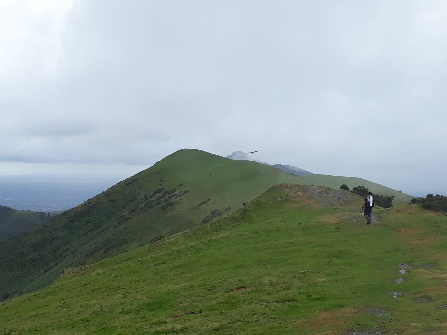 Allez, c'est reparti... Le passage des crêtes d'Iparla est vraiment la partie la plus belle de notre traversée, aérienne avec pas mal de ressaut à négocier... mais le mauvais temps s'installe pour de bon, la pluie d'intensifie et le vent souffle en continue entre 30 et 50 km/h, ce qui devient usant après plusieurs heures de marche ! Dans ces conditions, on n'a pas du tout envie de traîner et du coup on haussera substantiellement notre vitesse de marche... Pendant la redescente sur Bidarray, j'arrive même à trouver une bûchette de réseau pour réserver le resto qui va bien... avant 21h ;-)